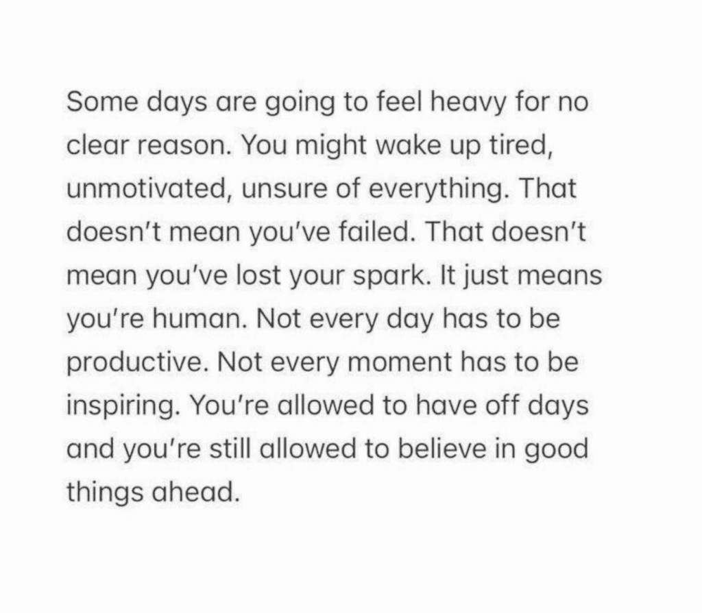 “If today feels heavy, carry it lightly. If it feels empty, fill it with the smallest comforts. A warm drink. An uplifting song. Soft clothes. A deep breath. You don’t have to fix today. You just have to move through it.”
