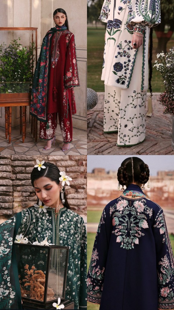 Zara Shahjahan’s previous karandi launches included elegant two-piece and three-piece sets. The two-pieces paired textured shirts with straight trousers in subtle prints and warm winter tones, perfect for everyday wear. The three-pieces added matching shawls with delicate embroidery or florals, creating a complete, graceful winter look. Both offered relaxed, flattering cuts and timeless Zara Shahjahan charm.
