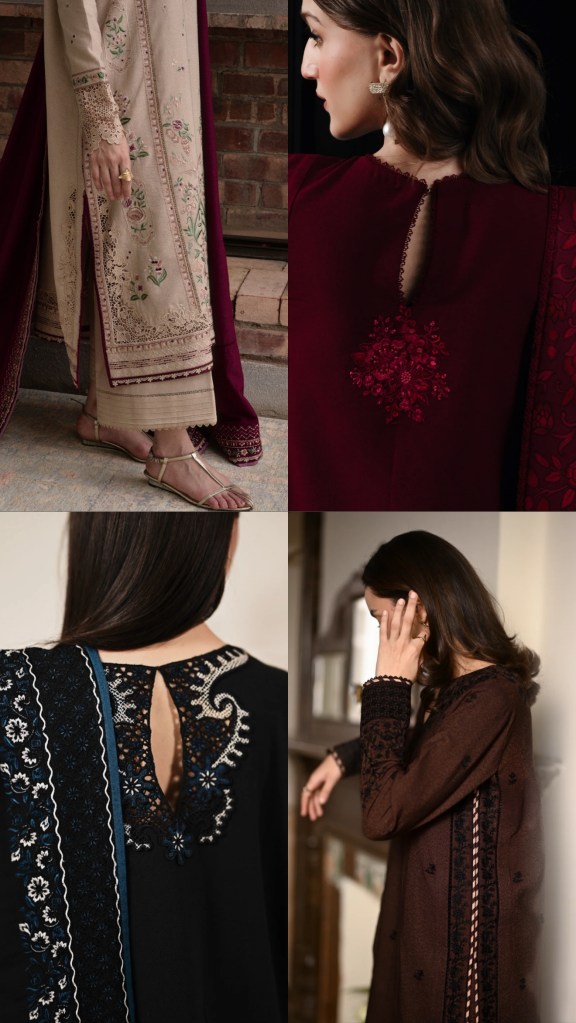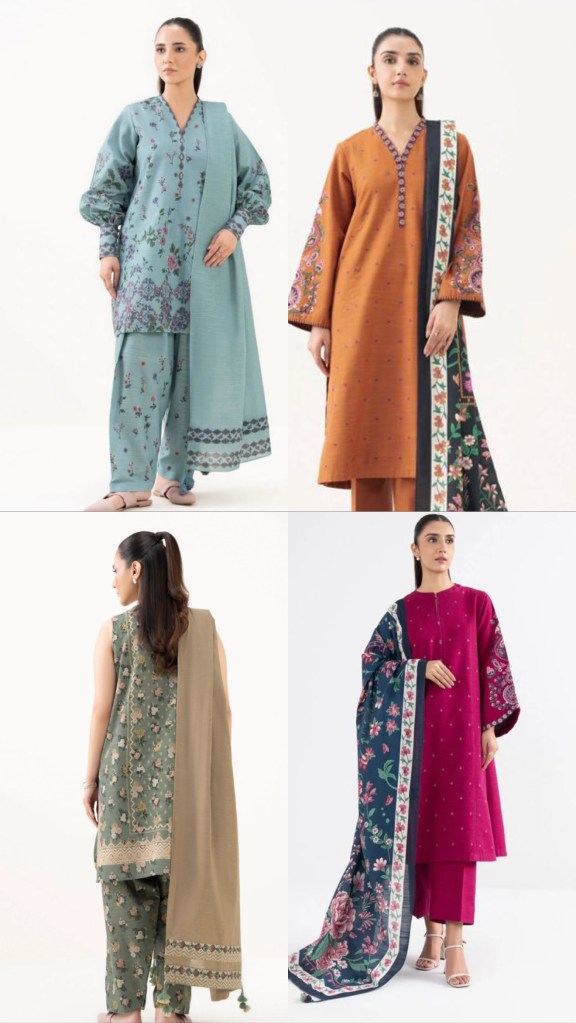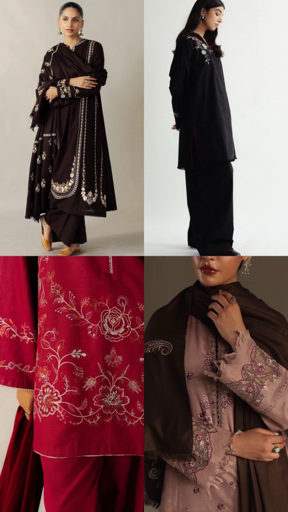 Zaib’s stitched karandi pieces are all about soft winter comfort with a clean, elegant look. The fabric is warm, slightly textured, and flows nicely without feeling heavy. Their designs are minimal yet refined—think subtle thread embroidery on the neckline or sleeves, soft winter prints, and muted seasonal colors. The cuts are relaxed and flattering, usually straight long kurtas paired with wide-leg or straight trousers that create an effortless, put-together silhouette. Necklines are simple and feminine, like V-necks, round-with-slit, or band collars. This season, Zaib truly stole the spotlight for me; their stitched and unstitched karandi sets won my heart instantly, and I ended up bagging all four outfits. They won’t be restocking these designs, so keep an eye out if something catches your attention. These are the kind of outfits you can style effortlessly and carry with complete ease—cozy, classy, and perfect for winter.