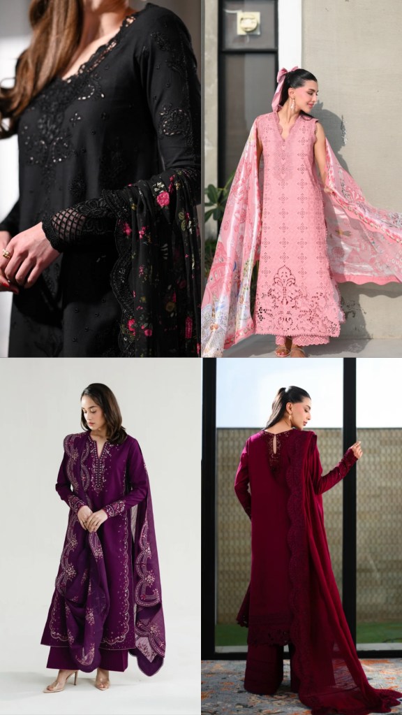 The fit and fall of these outfits is everything. The delicate chikankari, short shirts, and loose fitted shalwars are my absolute favorite combination. Since Iβm tall the silhouette falls even better on me and it just works. The red one has my heart but the baby blue and lilac are just as beautiful. I got the red when it had just launched and it sold out within days. I also love their plain scalloped dupattas and separate lowers. They offer such a beautiful variety of separates and it is definitely worth the price you pay. Definitely worth checking out.